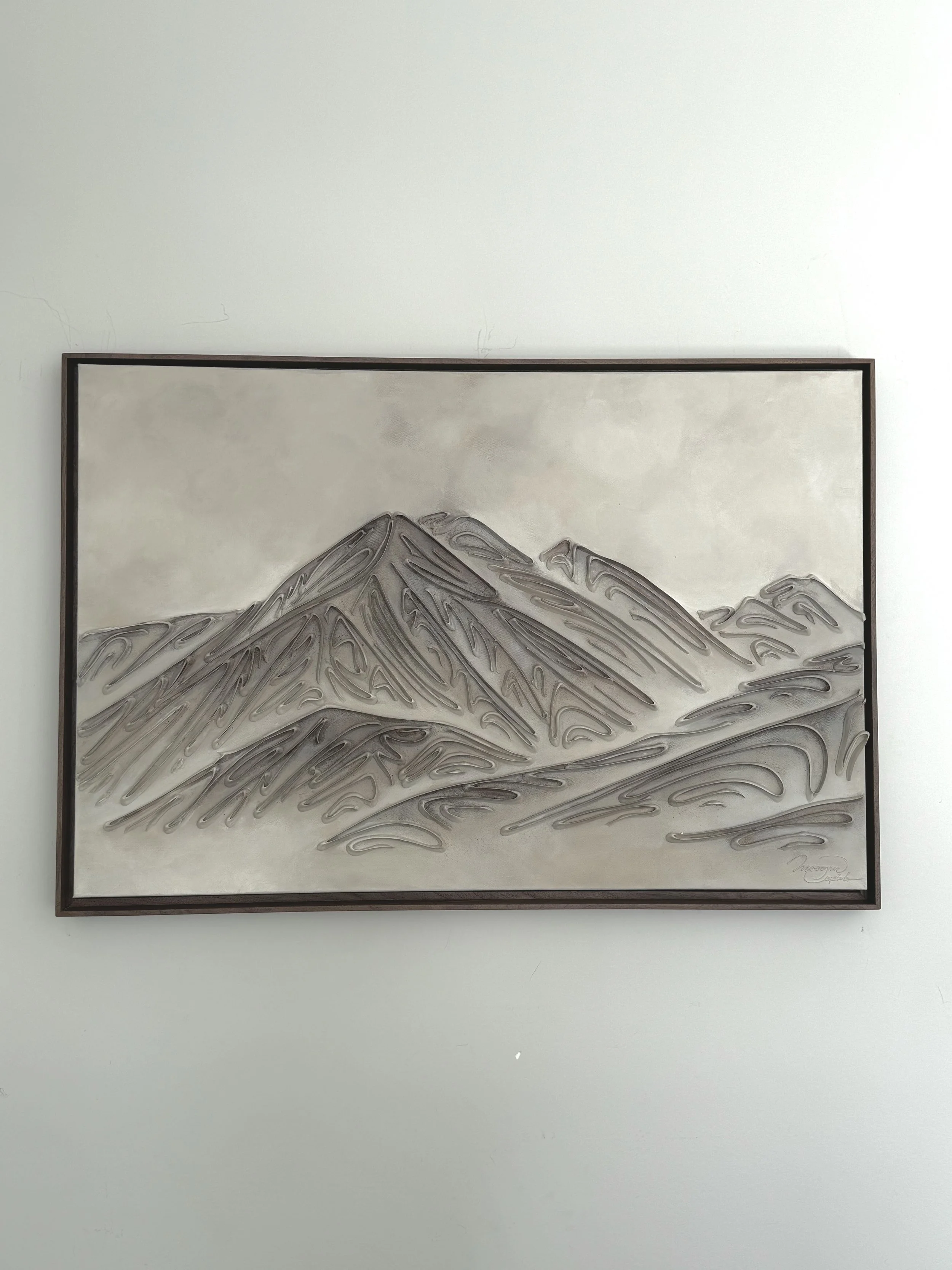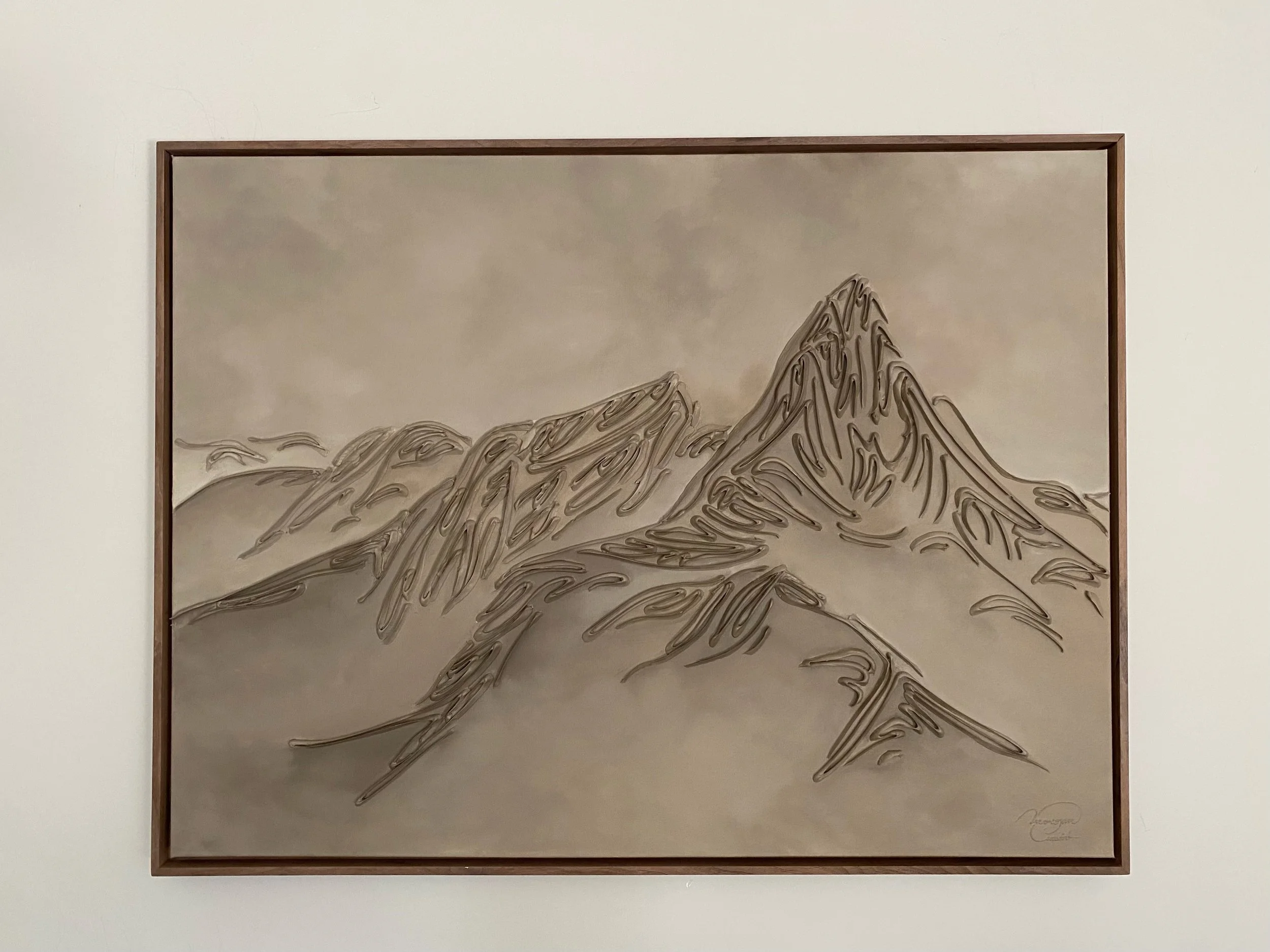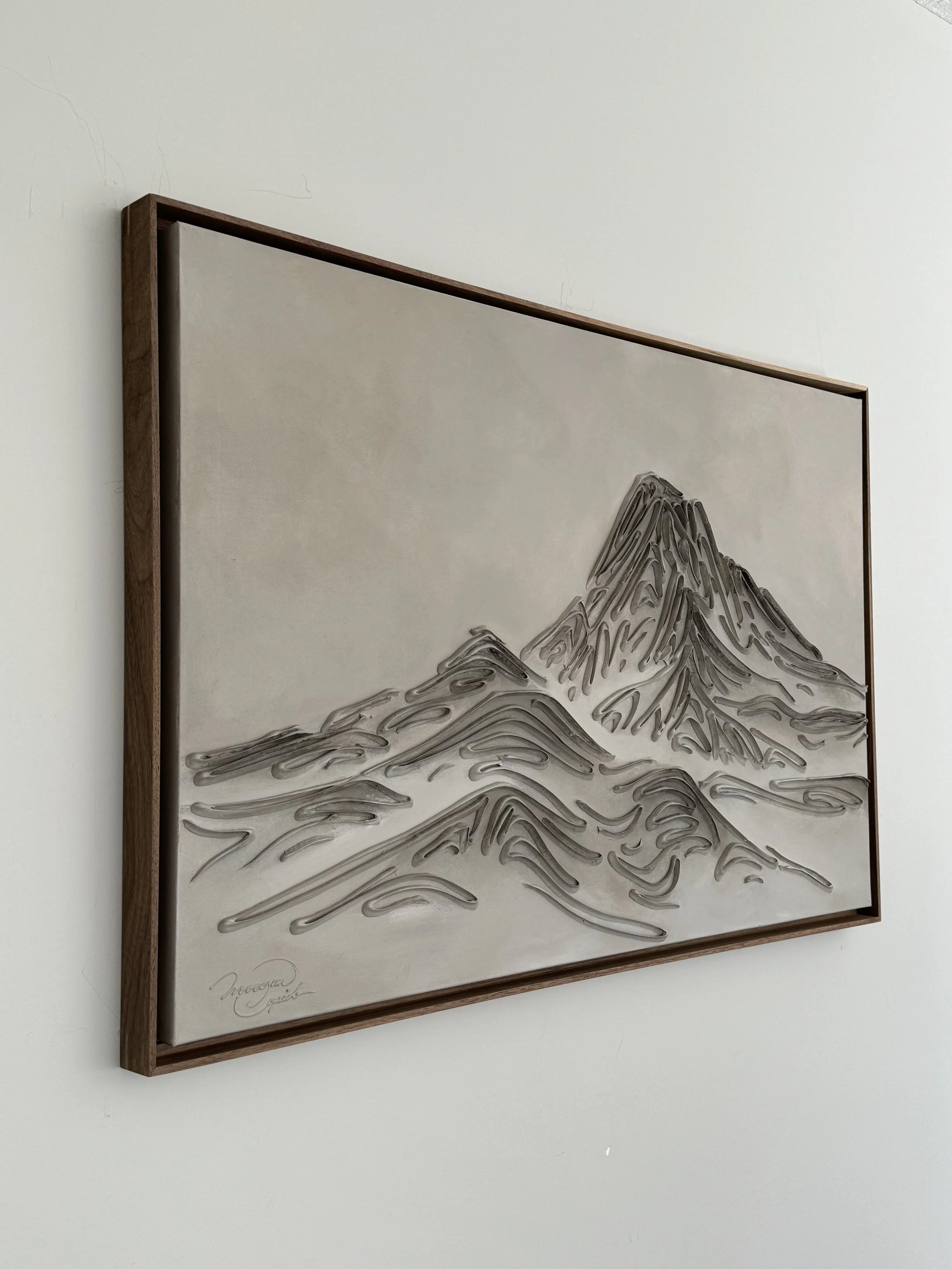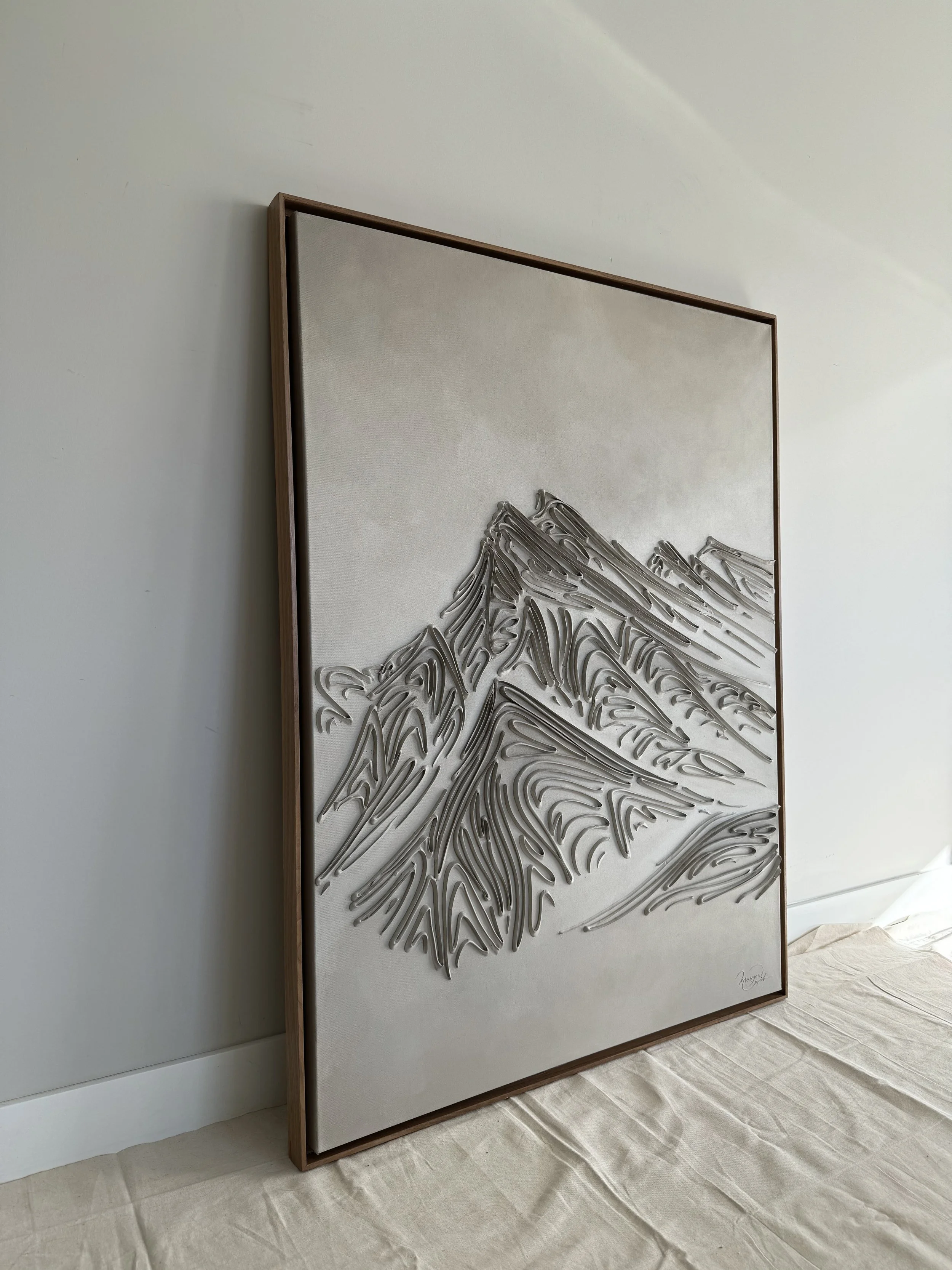 These pieces are a testament to my deep reverence for the enduring beauty of mountains and my fascination with fluid linework. The monochromatic palette and textures are not mere artistic choices, but an attempt to create a visual language that transcends the conventional boundaries of representation. I believe that in their simplicity, lines have the power to speak volumes, to tell stories, and to awaken a sense of contemplation. With this collection, I hope to bring you to a realm where the timeless grandeur of mountains meets the eloquence of lines. It's an exploration of the subtle intricacies that make these natural wonders so captivating and a tribute to the profound emotions they stir within us